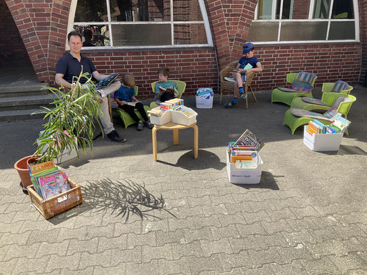 beim Zeichnen beobachten („Der zeichnet ja besser als meine Mama!“) und viele Fragen zu seinem Beruf stellen („Du bist doch ein Buchmacher?“). Natürlich las Herr Teich auch noch aus seinem