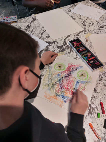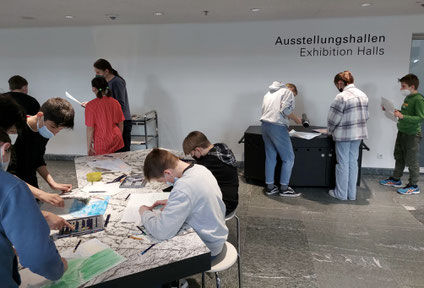 Zuerst wurden die Gemälde der alten Meister des 13.-18.Jahrhunderts besichtigt und "alte" Bekannte aus den Vorträgen der Schüler* innen aus dem Kunstunterricht im Original bewundert (z.B. Dürer und Rembrandt). Die Schüler* innen sollten dann einzelne Gegenstände im Detail aus den Gemälden abzeichnen. Im Workshop wurden diese Einzelgegenstände zu neuen "Gemälden" in Aquarelltechnik zusammengestellt. Ein spannendes Erlebnis mit besonderen künstlerischen Ergebnissen.