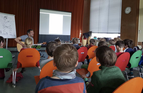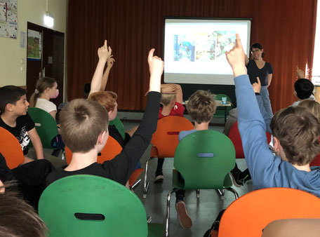 Lena Hach, stellt sich und den ersten Band „Der unheimliche Fremde“ aus ihrer Kinderbuchreihe „Mission Hollercamp“ vor. Die Autorin las spannungsgeladen und mit pointiertem Witz aus mehreren Stellen ihres Kinderbuches, in dem es um die drei Kinder Jakub, Emily und Leon geht, die ihre Ferien auf dem „Hollercamp“ verbringen, vor. Im lebendigen Austausch erfuhren die Kinder im Anschluss viel Wissenswertes über die Arbeitsweise von Lena Hach als Autorin im Vergleich zu einer Lektorin, die Verlagsarbeit und einiges Privates, zum Beispiel, dass die Autorin sich schon immer gerne Geschichten ausgedacht hat. Sehr rege und kreativ beteiligten sich die SchülerInnen am Brainstorming zu möglichen künftigen Covergestaltungen und Inhalten der Kinderbuchreihe, die von der Autorin fortgesetzt wird. Die Lesung wurde organisiert durch die Bibliothekarin unserer Schule, Angelika Bruck, finanziell unterstützt wurde die Autorenlesung durch den Förderverein.