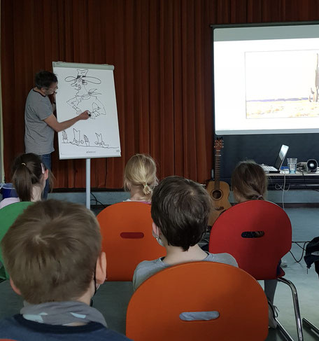 Die Kinder der Klasse 2a durften heute Prärieluft schnuppern! Der Berliner Kinderbuchautor und Illustrator Karsten Teich entführte die Kinder in den Wilden Westen. Die Kinder konnten ihn